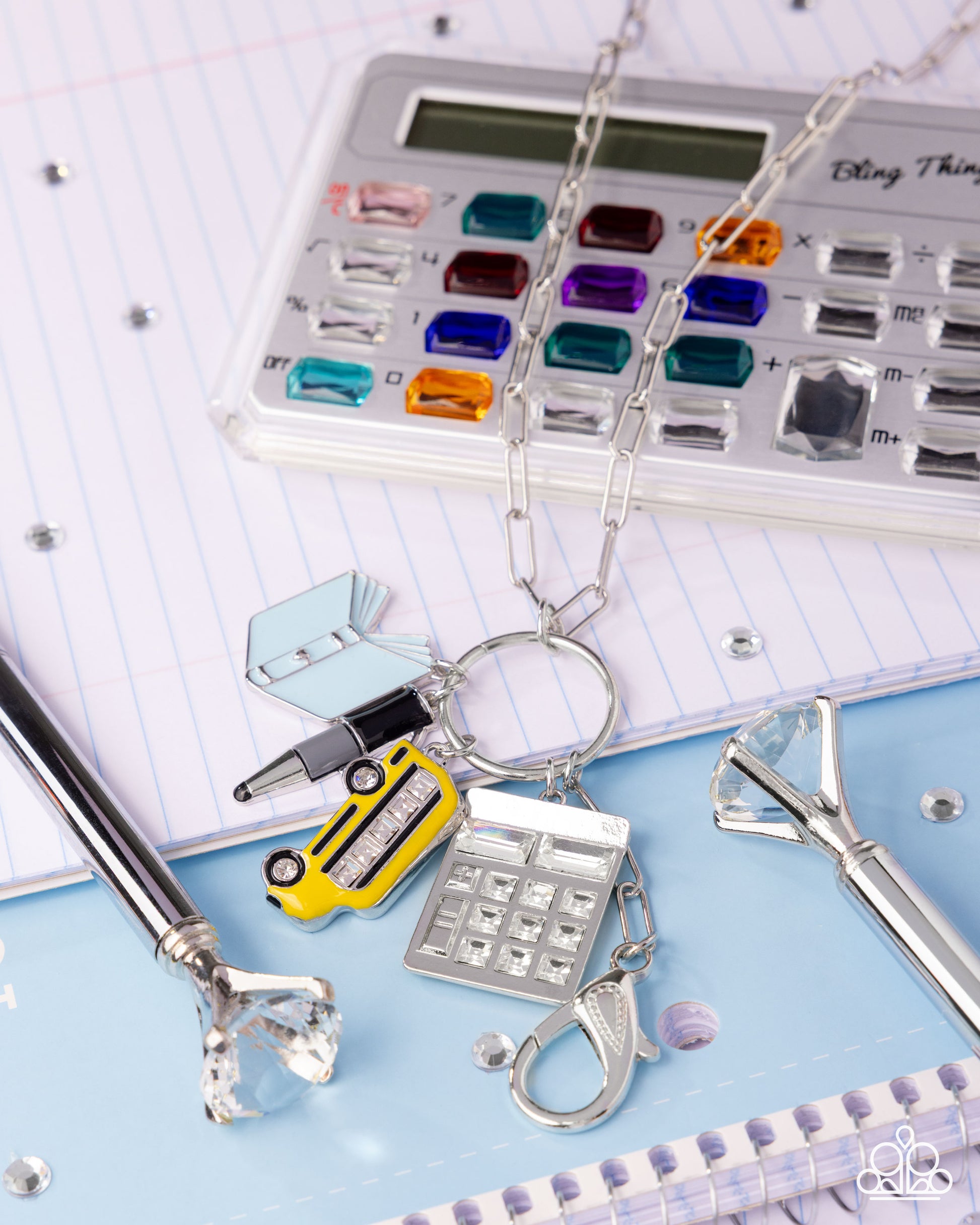A silver paperclip chain is adorned with a playful collection of academic-inspired charms, including a calculator featuring white gems, a yellow school bus with white gem windows, a black and gray pen, and a blue book. Features an adjustable clasp closure. A lobster clasp hangs from the bottom of the design to allow a name badge or other item to be attached.