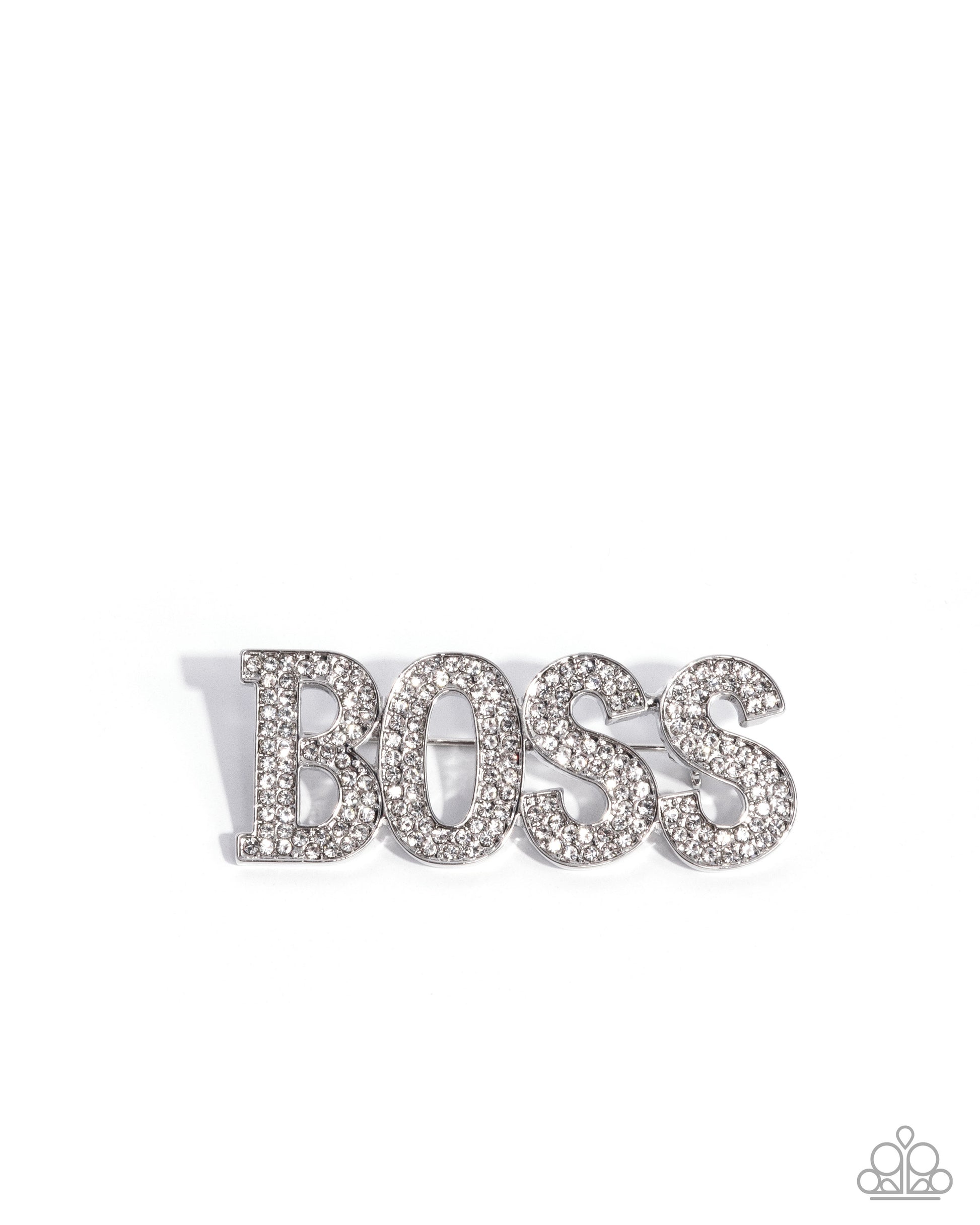 Embossed in dainty white rhinestones, glistening silver letters spell out the word "BOSS" reflecting light in every direction for a corporate chic centerpiece. Brooch measures approximately 1/2" in length and 2" in width.