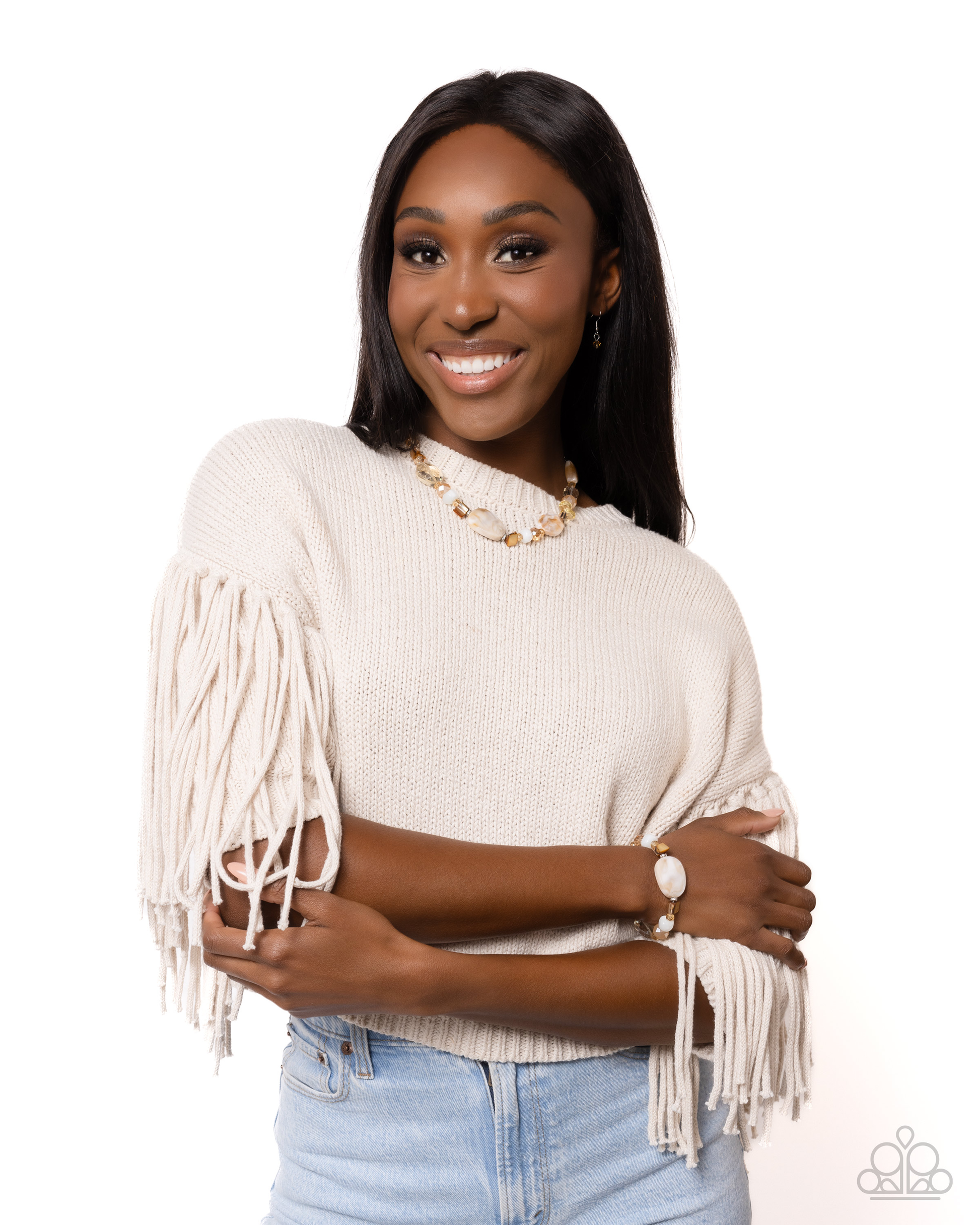 Connected to a silver chain and utilizing warm neutral shades, a hodgepodge of beads in various sizes, opacities, and materials come together to create an artistically abstract display. Features an adjustable clasp closure. As the stone elements in this piece are natural, some color variation is normal.