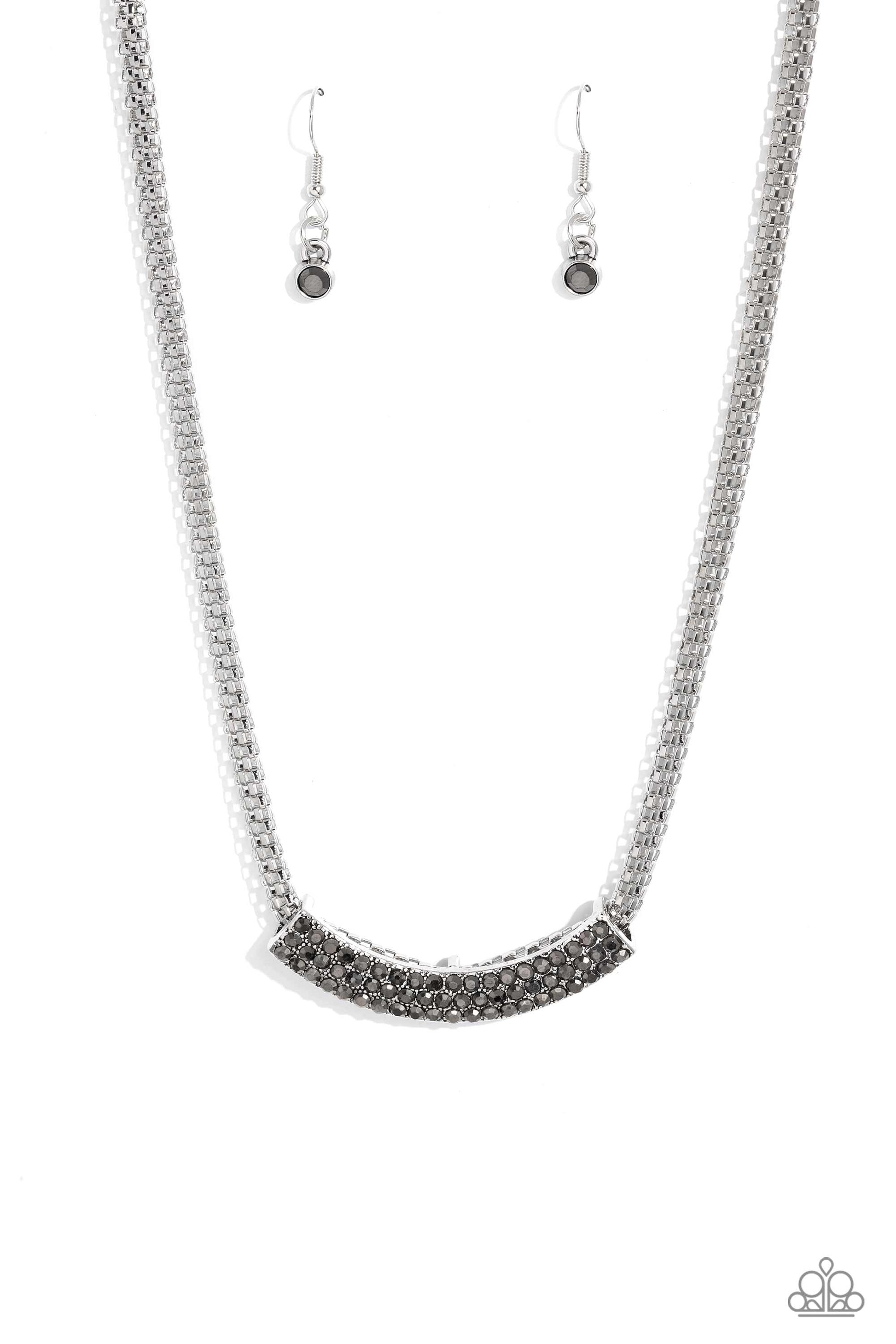 Featuring a high-sheen finish, a curved silver pendant slides along a rounded silver mesh chain below the collar. Three rows of dainty hematite rhinestones encrusted along the silver frame, add hints of shimmer to the bold industrial palette. Features an adjustable clasp closure.
