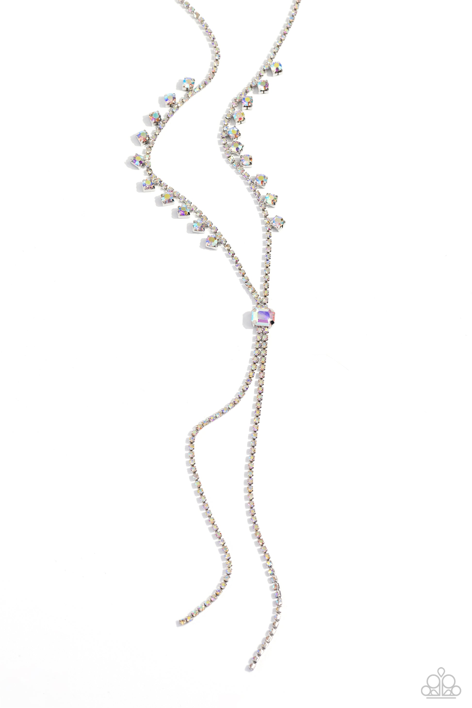 Attached to a section of dainty silver chain, iridescent rhinestones, pressed into shiny silver box chain fittings swing down the neckline in a lariat-like manner for an effulgent glow. Sporadically dancing along the box chain, exaggerated iridescent rhinestones in solitaire square fittings adorn the sparkly display for additional refinement and class. An emerald-cut iridescent gem rests along the decadent display, separating the iridescent chain into two strands. Features an adjustable clasp closure. Due to its prismatic palette, color may vary.