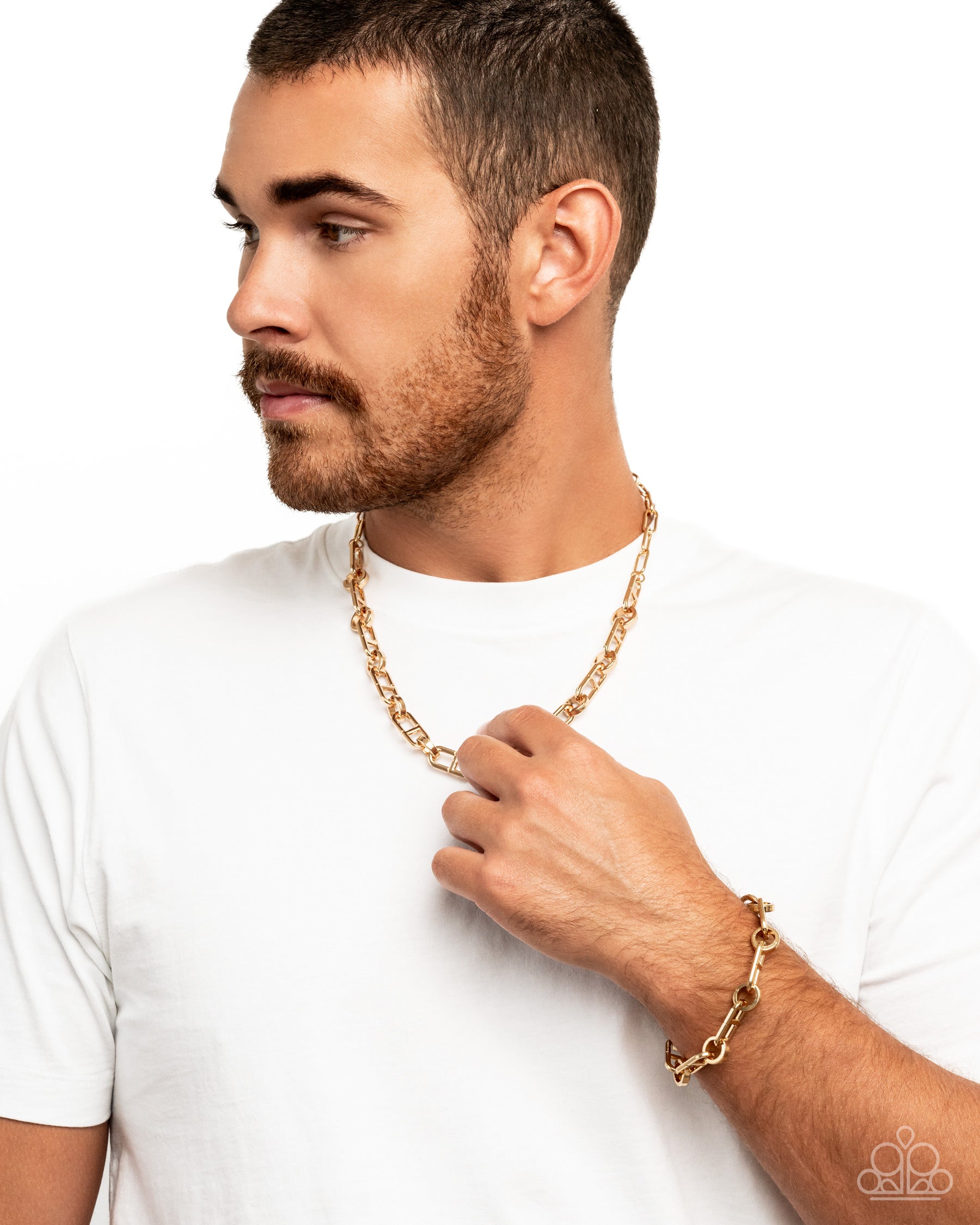 Alternating with gold wheel-like links, gold anchor links cascade along the neckline, connecting to gold paperclip chain links for a glistening, industrial display. Features an adjustable clasp closure.